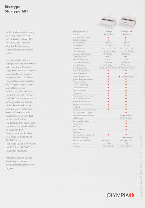 Prospekt für Schreibmaschine Olympia Startype, Startype MD Kompakte Schreibmaschinen für Profis Nr. DB/7690 3.99