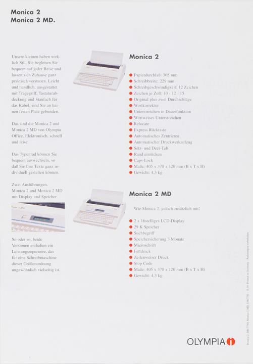 Prospekt für elektronische Schreibmaschine Olympia Monica 2, Monica 2 MD Die kleinen Feinen. Elektronische Portable-Schreibmaschinen Nr. DB/7790 11.98