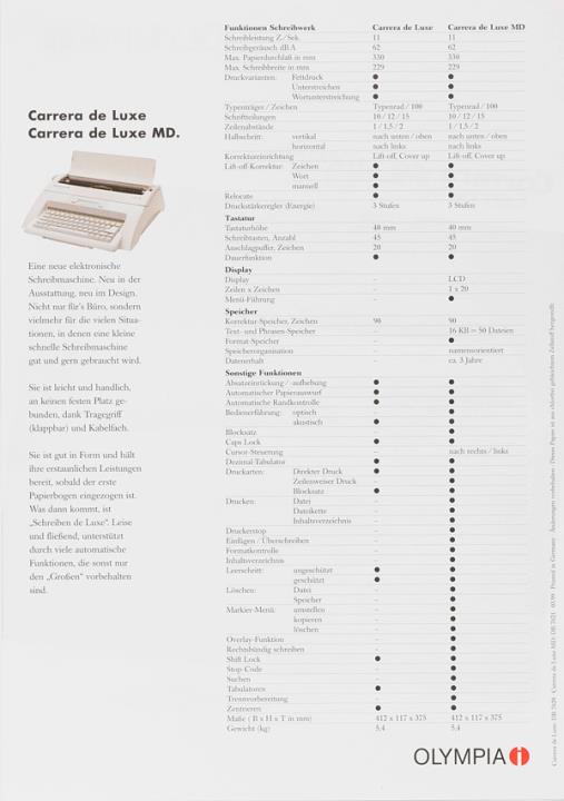 Prospekt für elektronische Schreibmaschine Olympia Carrera de Luxe, Carrera de Luxe MD Aus Freude am Schreiben Nr. DB/7620 03.99