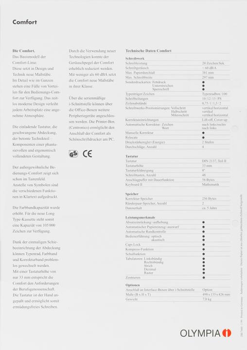 Prospekt für elektrische Schreibmaschine Olympia Comfort Schreiben in seiner schönsten Form Nr. DB/7660 1.99