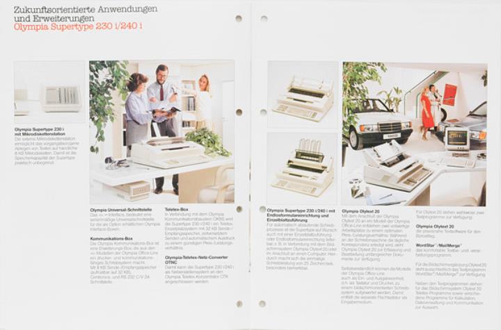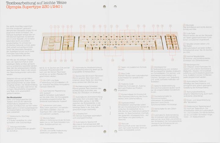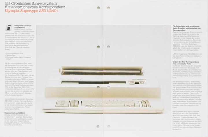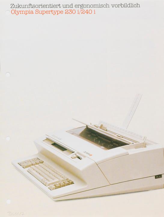 Prospekt für elektronische Schreibmaschine Olympia Supertype 230 i, 240 i Zukunftsorientiert und ergonomisch vorbildlich Nr. 5/11042/01 03.87