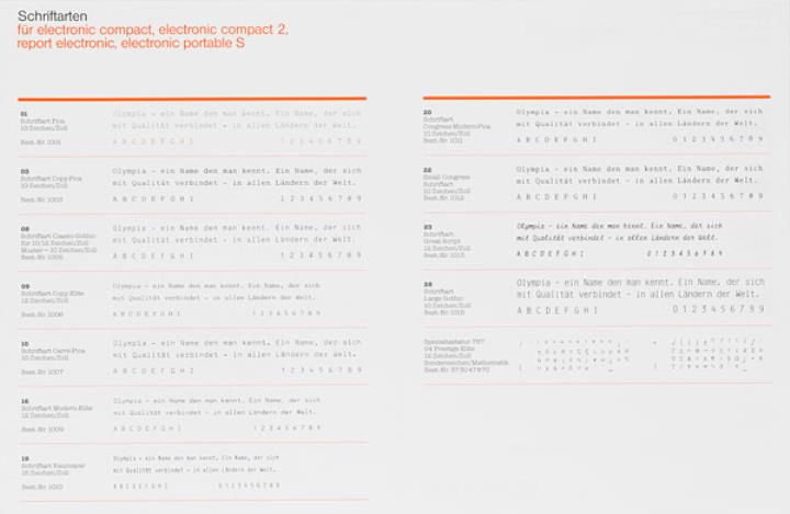 Faltprospekt zu Schriftarten und Zubehör für Schreibmaschine Olympia electronic compact, electronic compact 2, report electronic, electronic portable S Nr. 5/21 055/01