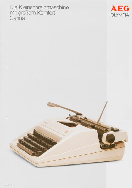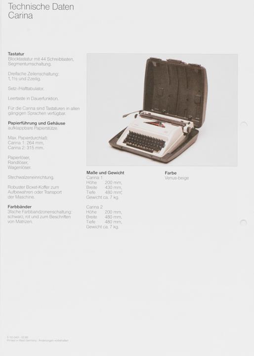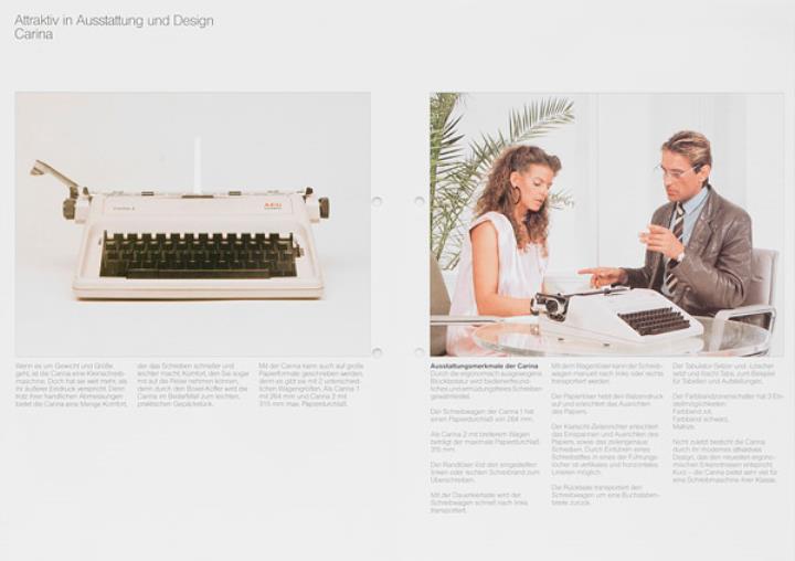 Faltprospekt für Schreibmaschine AEG Olympia Carina Die Kleinschreibmaschine mit großem Komfort Nr. 5110 0401 02.88