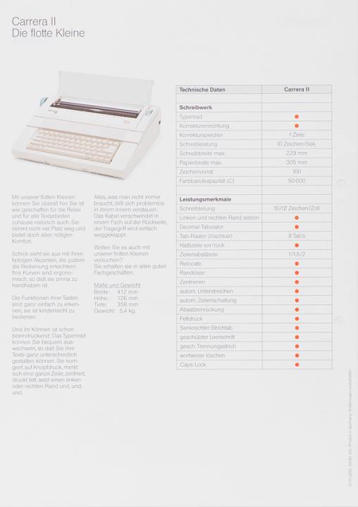 Prospekt für elektrische Schreibmaschine AEG Olympia Carrera II Nr. 5/111/2001 09.90 WV