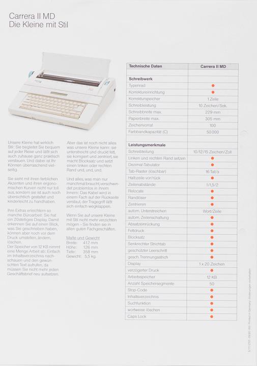 Prospekt für elektrische Schreibmaschine AEG Olympia Carrera II MD Nr. 5/111/2101 09.90 WV