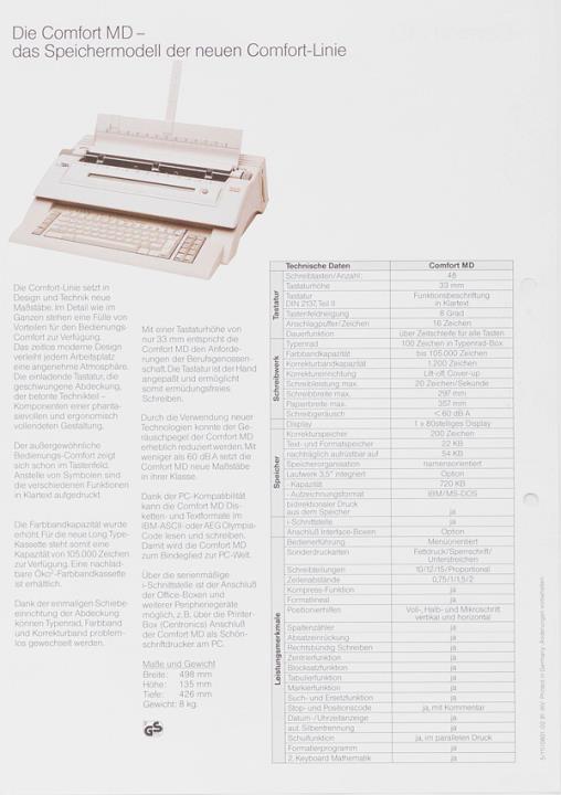 Prospekt für elektronische Schreibmaschine AEG Olympia Comfort MD Nr. 5/111/0801 02.91 WV