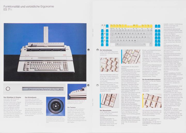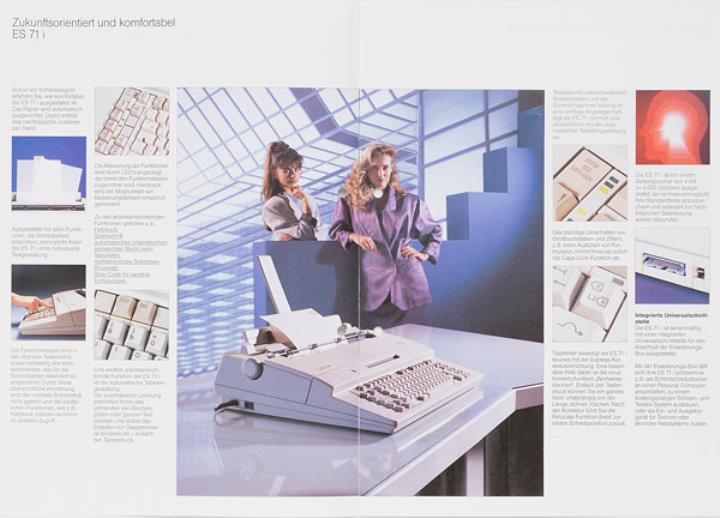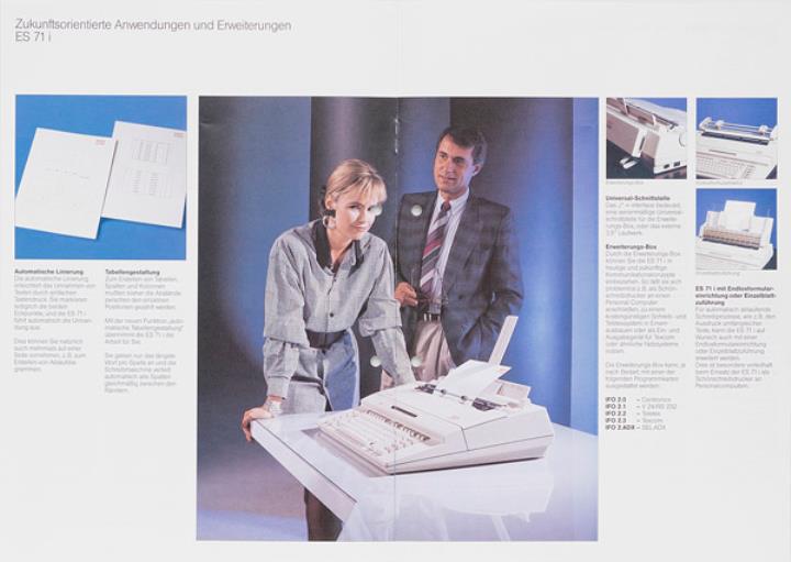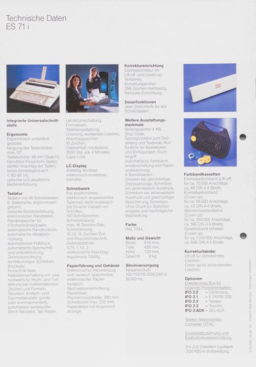 Prospekt für elektronische Schreibmaschine AEG Olympia ES 71 i Elektronisch schreiben, komfortabel und zukunftsorientiert Nr. 5/110/7901 03.89