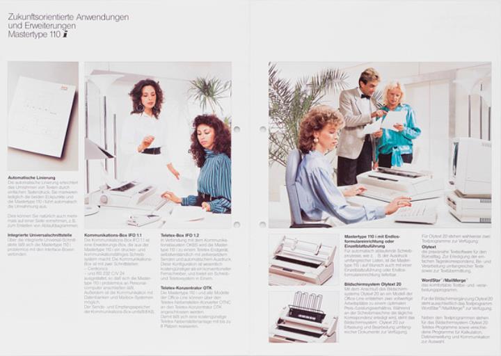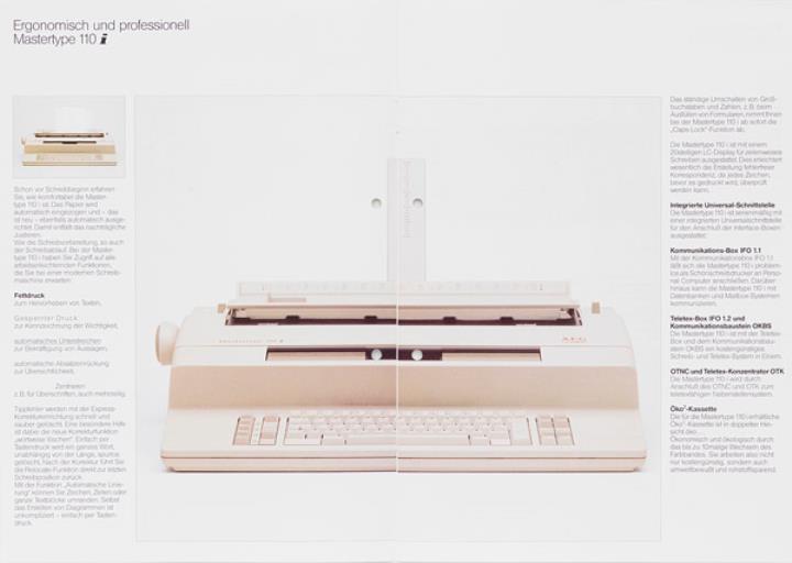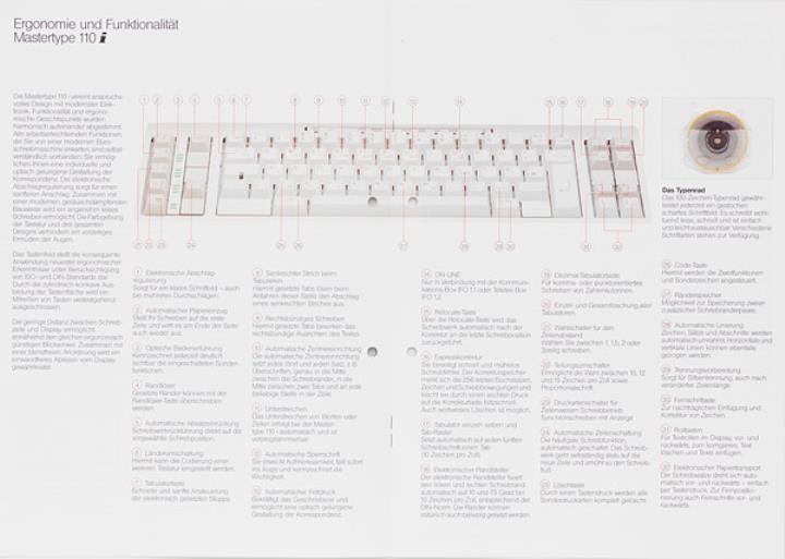 Prospekt für elektronische Schreibmaschine AEG Olympia Mastertype 110 i Vorbildliche Ergonomie und professionelle Ausstattung Nr. 5 110 9601 02.88