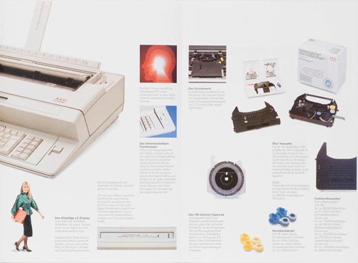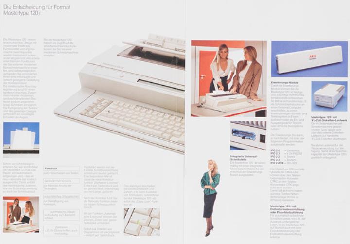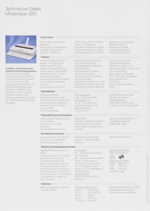 Faltprospekt für elektronische Schreibmaschine AEG Olympia Mastertype 120 i Schreibkomfort und Leistungsvielfalt Nr. 5/110/1801 03.90