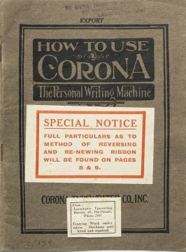 Bedienungsanleitung für Schreibmaschine Corona Vorderseite mit Papieraufkleber versehen "Special Notice (...)"