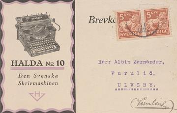 Postkarte mit Werbebild; Grafik, polychrom Vorderseite: adressiert an Herr Zernander, Ulvsby; Briefmarke Sverige 5+5 Öre; Poststempel 1922 Rückseite beschrieben (Maschinenschrift)