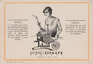 Werbepostkarte; Grafik, polychrom Vorderseite: Frau mit Schreibmaschine Ideal; Werbetext Rückseite: Ansicht Sächsische Schweiz (Svizzera di Sassonia); in acht vorgedruckten Feldern Briefmarken Deutsches Reich, verschiedene Postwerte, teilweise mit Poststempel