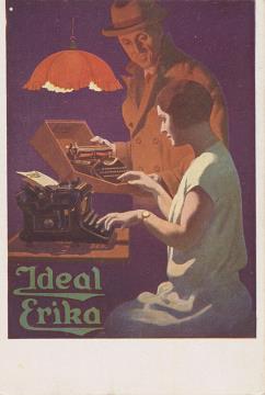 Werbepostkarte; Grafik, polychrom Rückseite: Frau/Sekretärin mit Schreibmaschine Ideal, Mann/Vertreter mit Schreibmaschine Erika Vorderseite nicht beschrieben