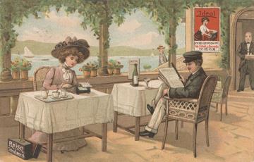 Werbepostkarte; Grafik, polychrom Rückseite: Hotelveranda mit Ausblick auf einen See; Mann mit Zeitung, Frau mit Reiseschreibmaschine, Werbeplakat im Hintergrund Vorderseite: beschrieben, datiert 16.11.1917; adressiert an Frau Obderschalek, Wien; Briefmarke Österreichische Post 10 Heller; Poststempel unleserlich