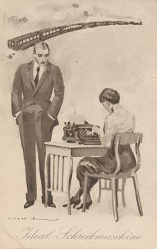 Werbepostkarte; Grafik, monochrom Rückseite: Vorgesetzter und Sekretärin mit Schreibmaschine, im Hintergrund ein Zug mit Dampflokomotive Vorderseite: beschrieben, adressiert; Feldpost, Poststempel Heidelberg/26.2.1915