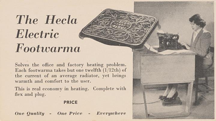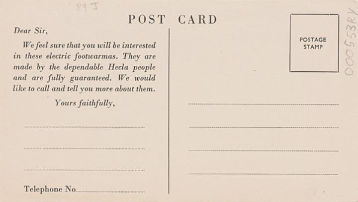Werbepostkarte; Fotografie, monochrom Rückseite: Sekretärin mit Schreibmaschine und Fußheizgerät; Werbetext Vorderseite mit vorgedrucktem Bestelltext