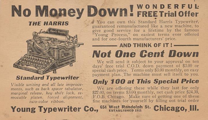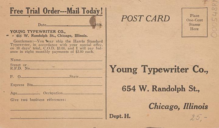 Antwortkarte; Grafik, monochrom Rückseite: Schreibmaschine Harris, Werbetext Vorderseite mit vorgedruckter Anschrift Young Typewriter Co., Chicago und Bestelltext