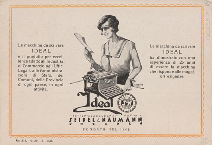 Next to literature on the history of technology, of the typewriter and the office, the Archive holds patent letters, textbooks and instruction manuals as well as historical postcards, letters, photographs and various kinds of advertising (leaflets and brochures, advertising stamps, newspaper ads, posters and signs, promotional gifts).