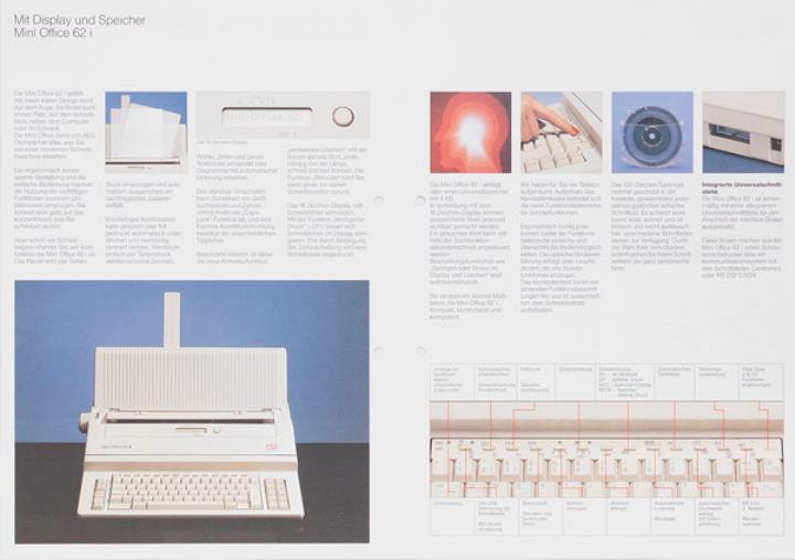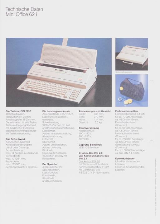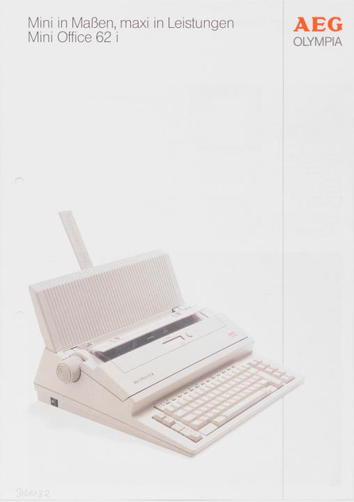 Faltprospekt für elektronische Schreibmaschine AEG Olympia Mini Office 62 i Mini in Maßen, maxi in Leistungen Nr. 5/110/1301 01.89