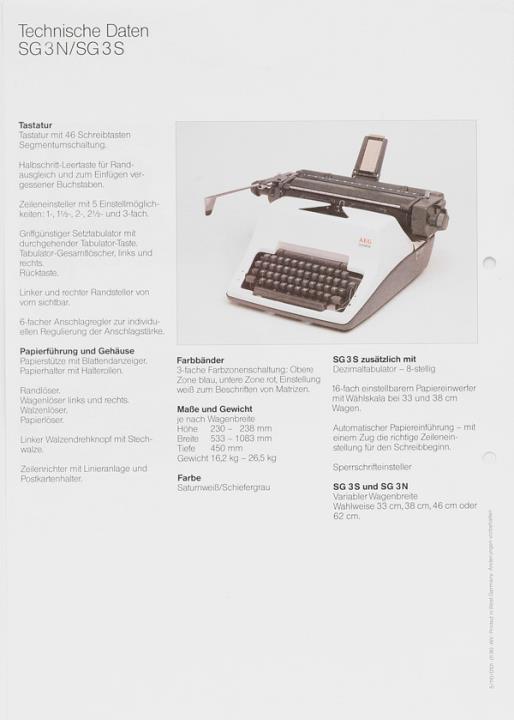 Faltprospekt für Schreibmaschine AEG Olympia SG 3 N, SG 3 S Nr. 5/110/0101 01.90