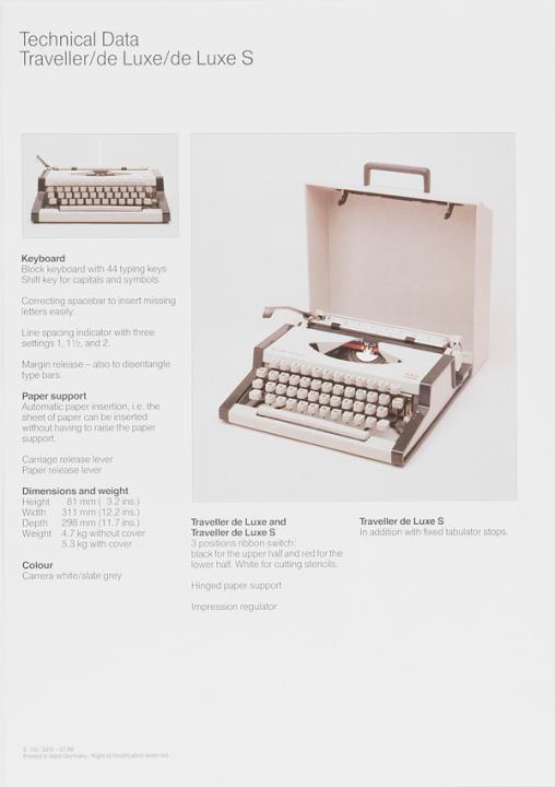 Faltprospekt für Reiseschreibmaschine AEG Olympia Traveller de Luxe Many technical features in a handy size Nr. 5 110 3010 07.88