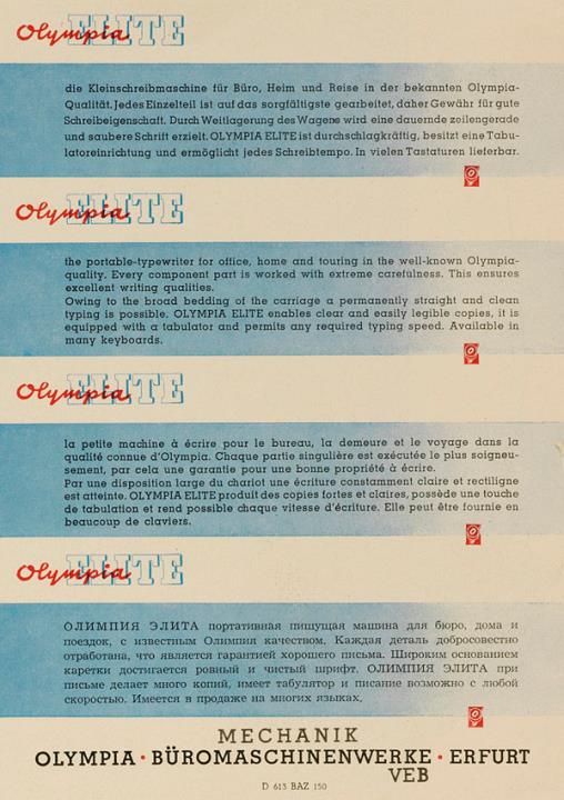 Prospekt für Schreibmaschine Olympia Elite Die vielverwendbare Kleinschreibmaschine Nr.D 613 BAZ 150