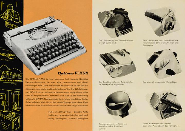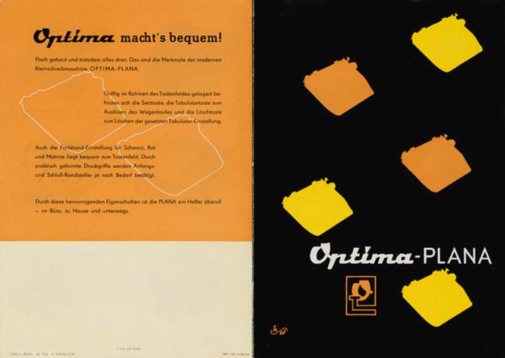 Faltprospekt für Schreibmaschine Optima Plana Nr. 6991 Li III-9-5 62 954 Grafik: h/w