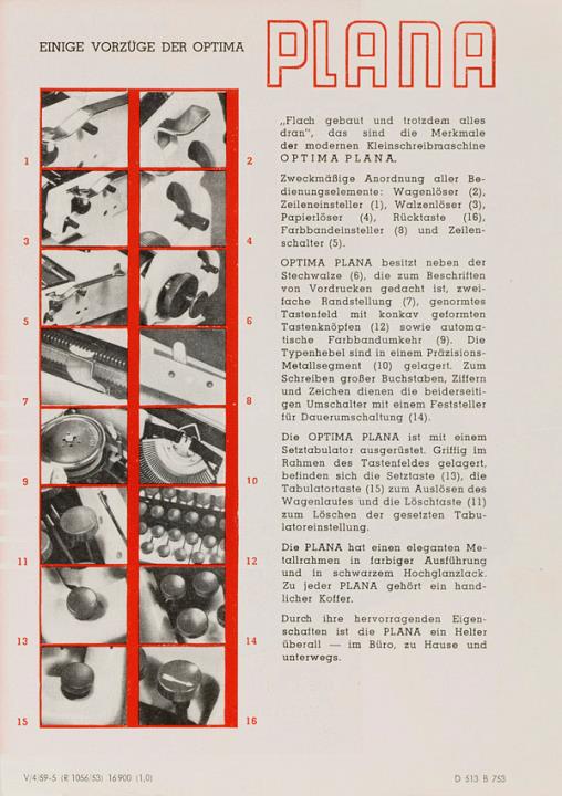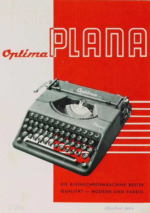 Prospekt für Schreibmaschine Optima Plana Die Kleinschreibmaschine bester Qualität - modern und farbig Nr. V/4/59-5 (R 1056/53) Datum handschriftlich vermerkt