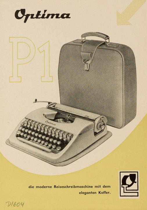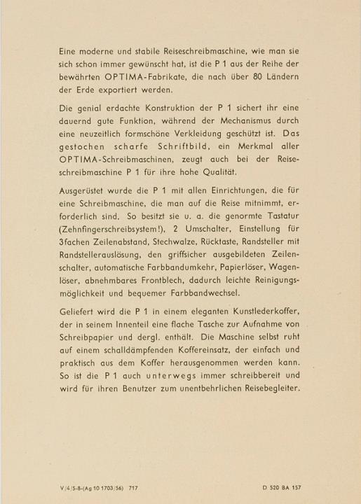Prospekt für Schreibmaschine Optima P1 die moderne Reiseschreibmaschine mit dem eleganten Koffer Nr. D 520 BA 157