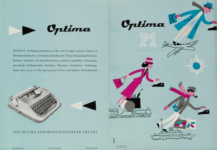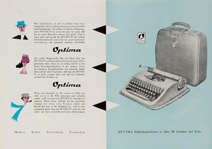 Faltprospekt für Schreibmaschine Optima P1 Nr. D 512 BA 857 Grafik: Margret