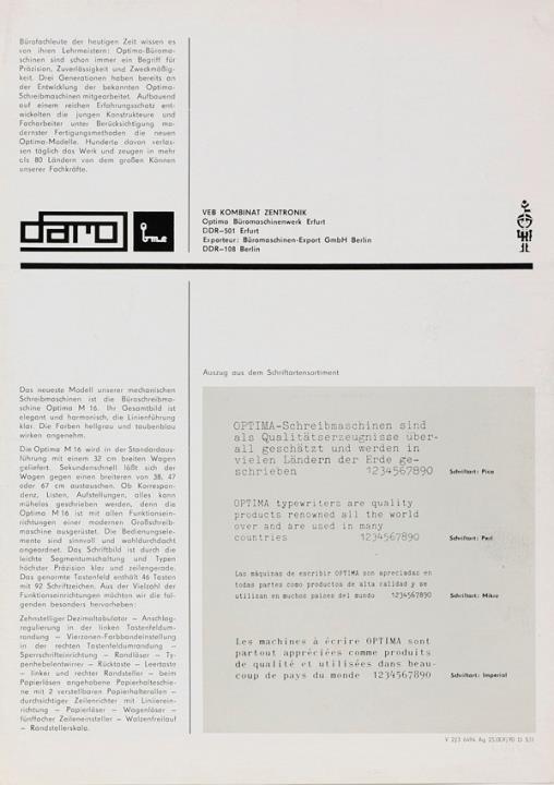 Prospekt für Schreibmaschine daro Optima M 16 Nr. V 2/3 6494 Ag25/009/70