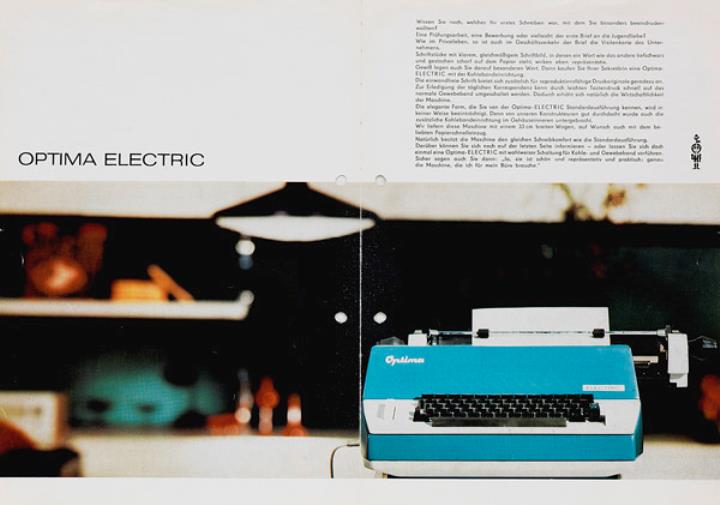 Faltprospekt für Schreibmaschine Optima Electric Nr. D524 B369 Datum handschriftlich vermerkt