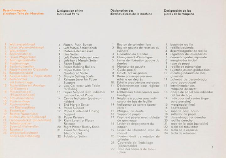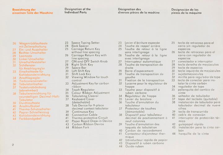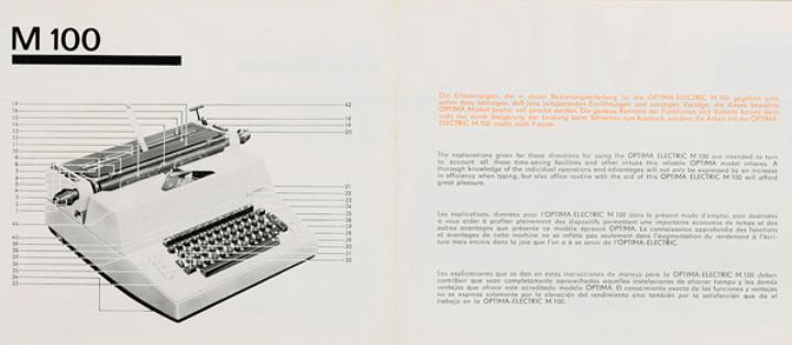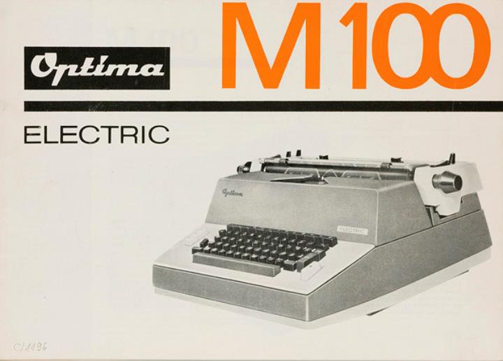 Bedienungsanleitung viersprachig für Schreibmaschine Optima M 100 Electric; Nr. 2 BCEJ 566 beiliegend Kontrollschein mit Schriftprobe für Maschine Nr. 5240 33 cm; Nr. V/4/59 Ag305/66/DDR