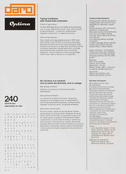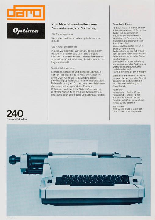 Faltprospekt dreisprachig für Schreibmaschine daro Optima 240