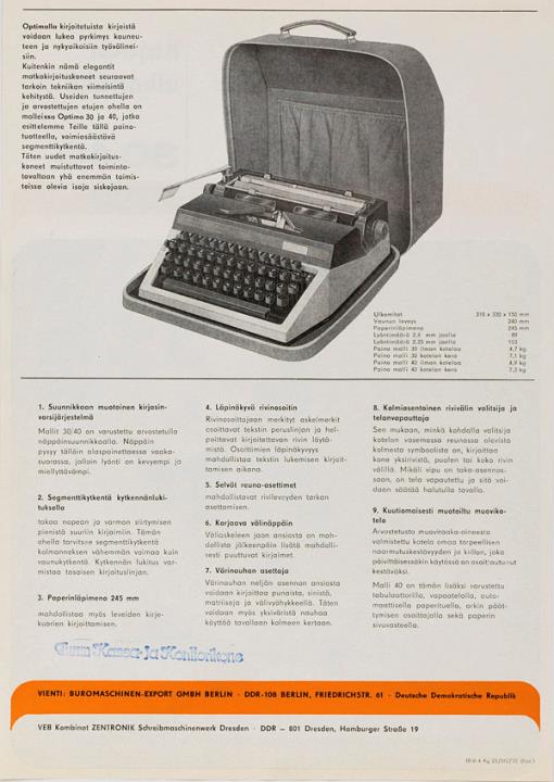 Prospekt in finnischer Sprache für Schreibmaschine daro Optima 30/40 Nr. III-9-4 Ag 25/012/72 (finn.)