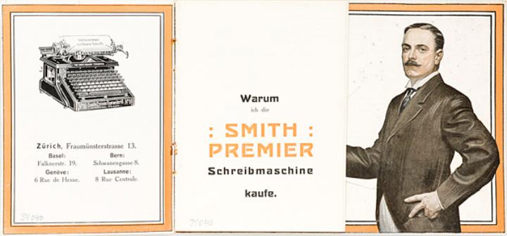 Prospekt für Schreibmaschine Smith Premier 10 mit handschriftlichem Vermerk, zwei Exemplare (eines fotokopiert/gebunden)
