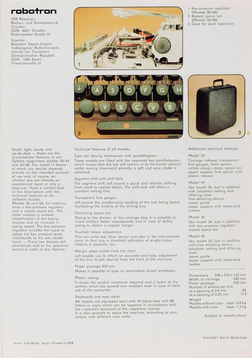 Prospekt für tragbare Schreibmaschine Optima 34/44, 50/60 Portable typewriter for spare time and profession Nr. III-9-4 It/G443/83 (engl.)