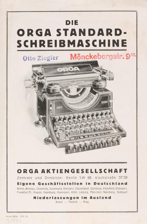 Next to literature on the history of technology, of the typewriter and the office, the Archive holds patent letters, textbooks and instruction manuals as well as historical postcards, letters, photographs and various kinds of advertising (leaflets and brochures, advertising stamps, newspaper ads, posters and signs, promotional gifts).