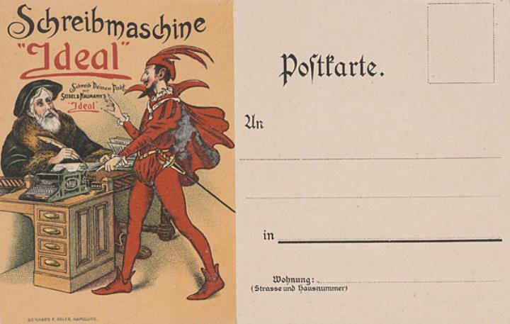 Postkarte mit Werbebild; Grafik, polychrom Vorderseite: Faust-Szene mit Schreibmaschine Ideal; Text: Schreib' Deinen Pakt mit Seidel & Naumann's Ideal Rückseite nicht beschrieben