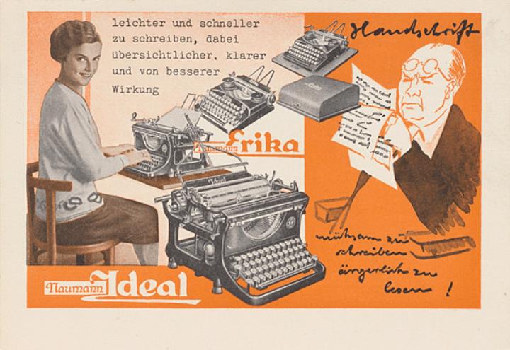 Next to literature on the history of technology, of the typewriter and the office, the Archive holds patent letters, textbooks and instruction manuals as well as historical postcards, letters, photographs and various kinds of advertising (leaflets and brochures, advertising stamps, newspaper ads, posters and signs, promotional gifts).