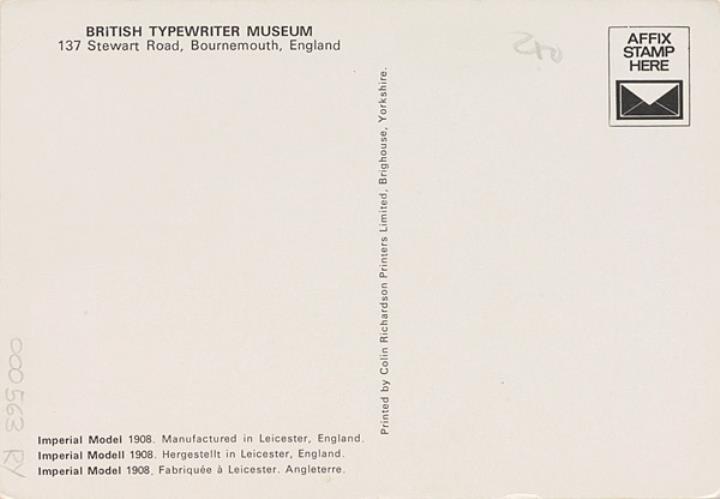 Illustrierte Postkarte; Fotografie, polychrom Rückseite: Schreibmaschine Imperial Vorderseite mit Beschreibungstext