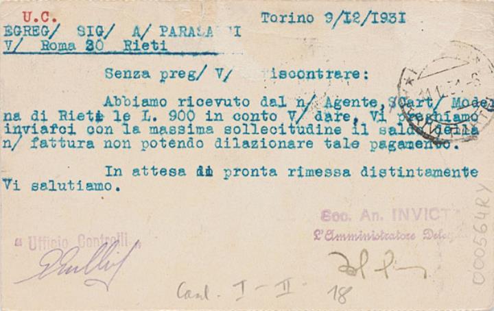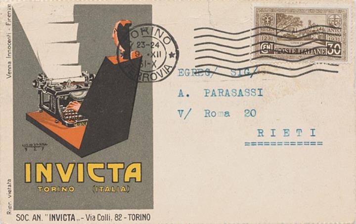 Postkarte mit Werbebild; Grafik, polychrom; Grafik: Lucio Venna 1927 Vorderseite: adressiert an Sig. Parasassi, Rieti; Briefmarke Poste Italiane 30 cent.; Poststempel Torino/9 XII 1931 Rückseite beschrieben (Maschinenschrift)