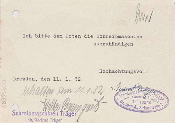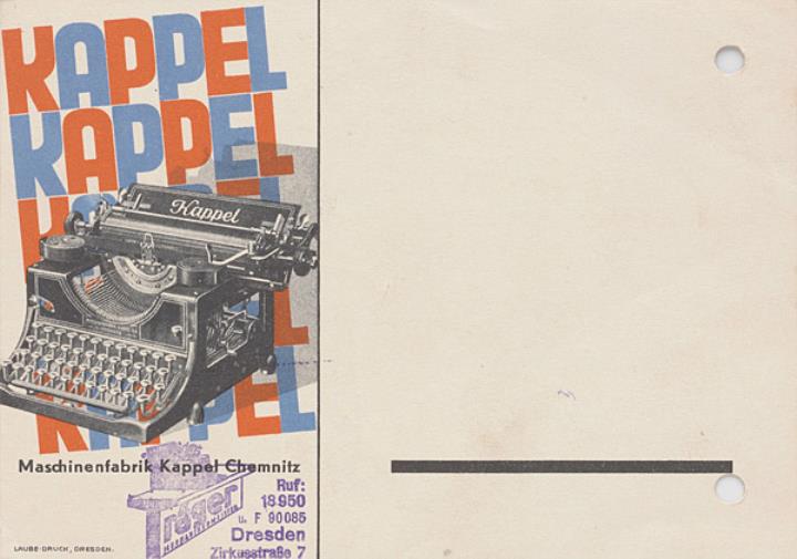 Postkarte mit Werbebild; Grafik, polychrom Rückseite: Schreibmaschine Kappel Vorderseite beschrieben, datiert 11.1.1932