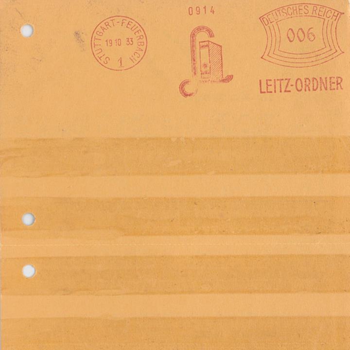 Klebepostkarte mit Firmendruck und Absenderfreistempel der Leitz Briefordnerfabrik adressiert (Maschinenschrift) an Fritz Wortmann, Wetter; Stempel: Stuttgart-Feuerbach/19.10.1933, Werbung Leitz-Ordner, Wert Deutsches Reich 6 RPf. Rückseite beschrieben (Maschinenschrift)
