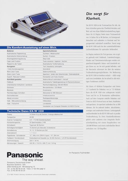 Prospekt für elektronische Schreibmaschine Panasonic KX-W 1030 Nr. 5/1992