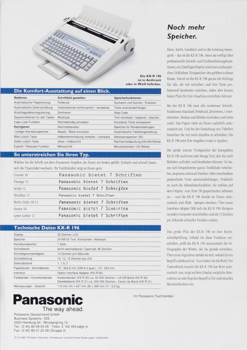 Prospekt für tragbare elektronische Schreibmaschine Panasonic KX-R 196 Nr. 2/1992