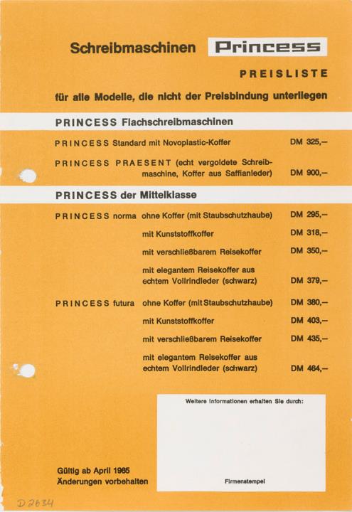 Preisliste für Schreibmaschine Princess Gültig ab April 1965