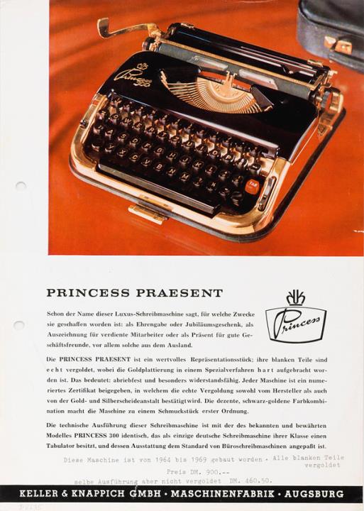 Prospekt für Schreibmaschine Princess Praesent (300) mit Echtvergoldung mit maschinenschriftlichem Vermerk