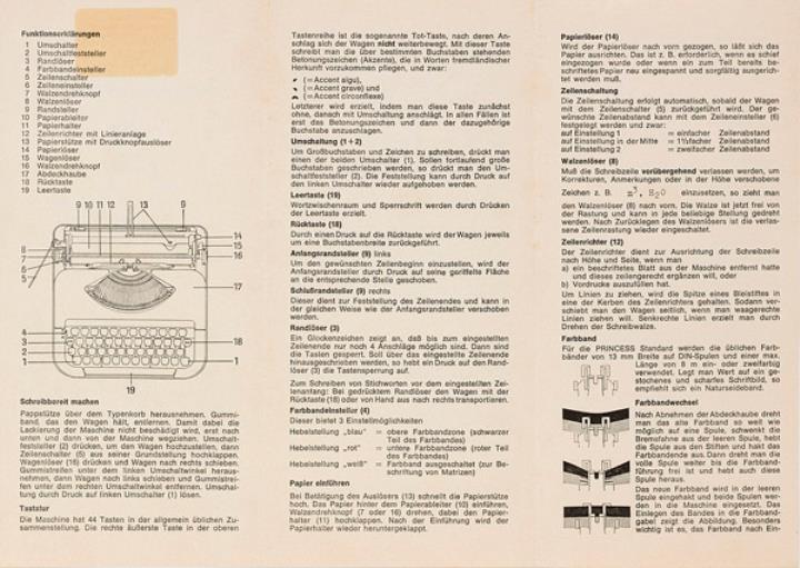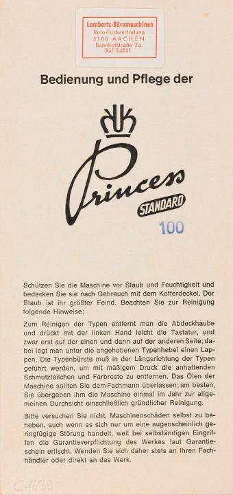 Bedienungsanleitung für Schreibmaschine Princess Standard Nr. 74-510-064/4/BSA 266-15 Vorderseite mit angebrachtem Adressetikett Lambert-Büromaschinen, Aachen
