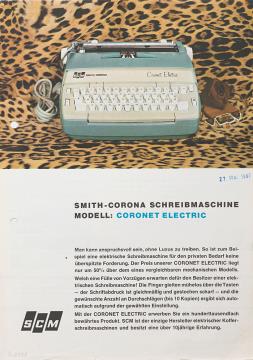 Prospekt für elektrische Schreibmaschine Smith-Corona Coronet Electric Nr. 1080 mit Datumstempel